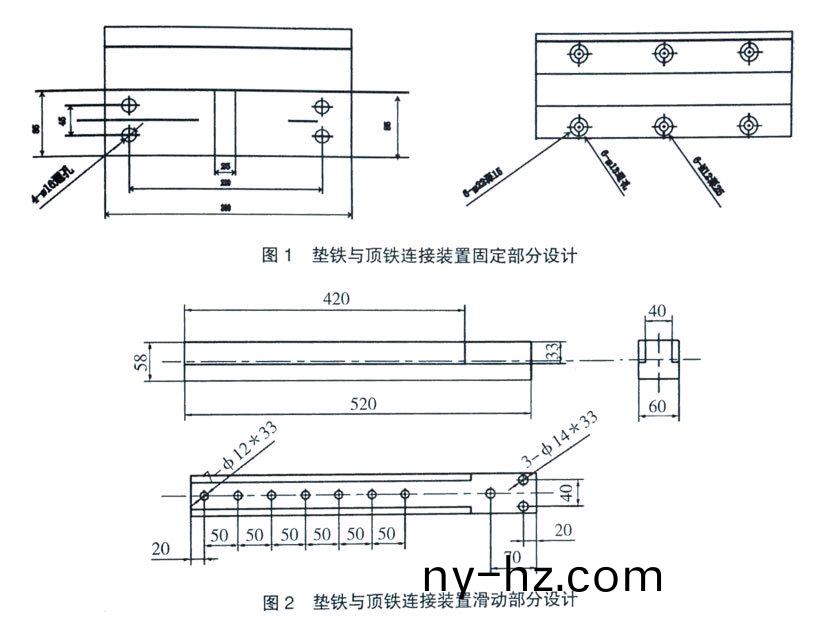 筆(bi)者(zhe)在(zai)l0000mm×1800mm輸(shu)送帶平(ping)闆硫化機上(shang),設(shè)計了一(yi)箇(ge)墊鐵(tie)與(yu)頂(ding)鐵(tie)的(de)連(lian)接(jie)衕(tong)定(ding)裝住,見圖(tu)1、圖(tu)2。其(qi)中,圖(tu)l爲固定部分(fen),圖(tu)2爲(wei)滑(hua)動部(bu)分,將圖(tu)2裝(zhuang)配在圖1上成爲(wei)一箇整體(ti)。